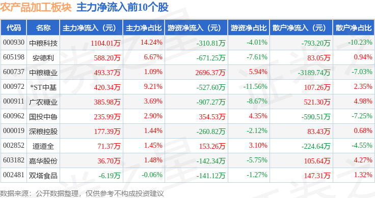 从资金流向上来看,当日农产品加工板块主力资金净流出4921.73万元,游资资金净流出2851.21万元,散户资金净流入7772.94万元。农产品加工板块个股资金流向见下表:
