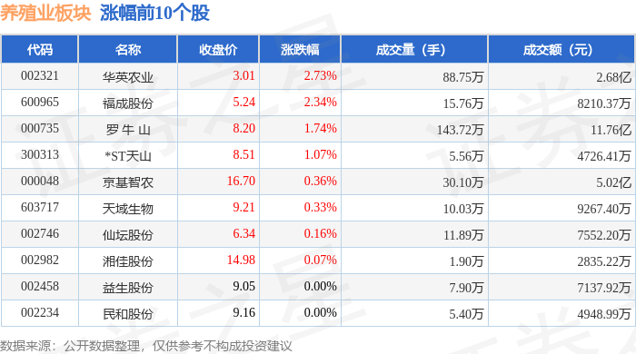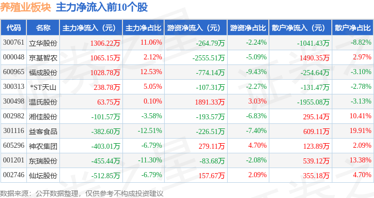 从资金流向上来看,当日养殖业板块主力资金净流出3.04亿元,游资资金净流入9316.6万元,散户资金净流入2.1亿元。养殖业板块个股资金流向见下表:
