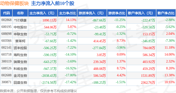 从资金流向上来看,当日动物保健板块主力资金净流出8190.8万元,游资资金净流入1018.33万元,散户资金净流入7172.47万元。动物保健板块个股资金流向见下表: