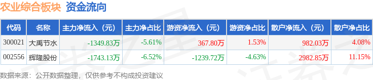 从资金流向上来看,当日农业综合板块主力资金净流出3092.96万元,游资资金净流出871.92万元,散户资金净流入3964.88万元。农业综合板块个股资金流向见下表: