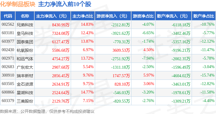从资金流向上来看,当日化学制品板块主力资金净流出19.4亿元,游资资金净流入5.79亿元,散户资金净流入13.61亿元。化学制品板块个股资金流向见下表: