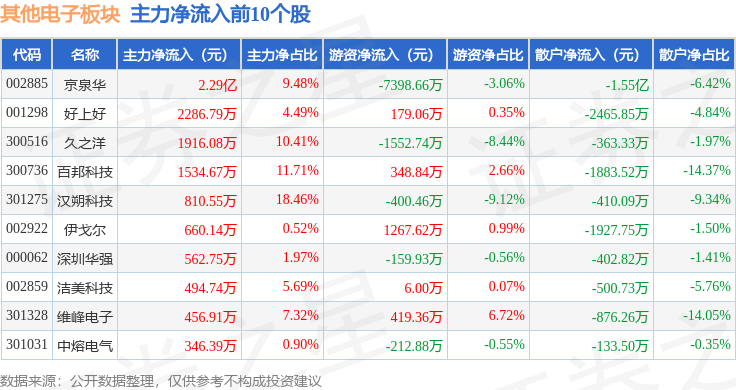 从资金流向上来看,当日其他电子板块主力资金净流出4.16亿元,游资资金净流出360.61万元,散户资金净流入4.2亿元。其他电子板块个股资金流向见下表:
