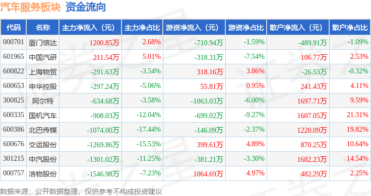 从资金流向上来看,当日汽车服务板块主力资金净流出5911.06万元,游资资金净流出1480.34万元,散户资金净流入7391.4万元。汽车服务板块个股资金流向见下表: