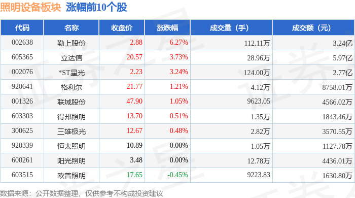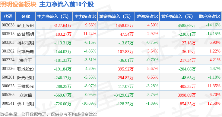 从资金流向上来看,当日照明设备板块主力资金净流出4366.94万元,游资资金净流入949.43万元,散户资金净流入3417.51万元。照明设备板块个股资金流向见下表: