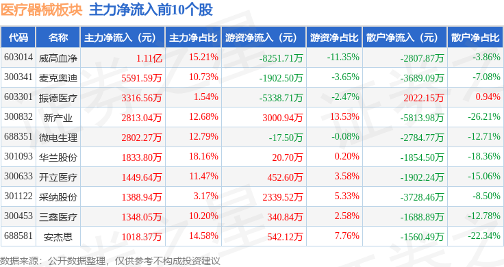 从资金流向上来看,当日医疗器械板块主力资金净流出7.92亿元,游资资金净流入3.91亿元,散户资金净流入4.01亿元。医疗器械板块个股资金流向见下表: