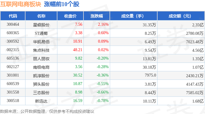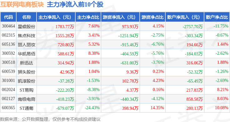 从资金流向上来看,当日互联网电商板块主力资金净流出2.33亿元,游资资金净流出601.17万元,散户资金净流入2.39亿元。互联网电商板块个股资金流向见下表: