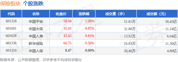 证券之星消息,11月4日保险板块较上一交易日上涨0.75%,中国平安领涨。当日上证指数报收于3960.19,下跌0.41%。深证成指报收于13175.22,下跌1.71%。保险板块个股涨跌见下表: