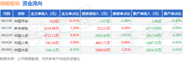 从资金流向上来看,当日保险板块主力资金净流入4.74亿元,游资资金净流出7998.31万元,散户资金净流出3.94亿元。保险板块个股资金流向见下表: