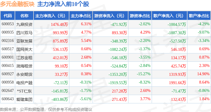 从资金流向上来看,当日多元金融板块主力资金净流出8.44亿元,游资资金净流入1.66亿元,散户资金净流入6.78亿元。多元金融板块个股资金流向见下表: