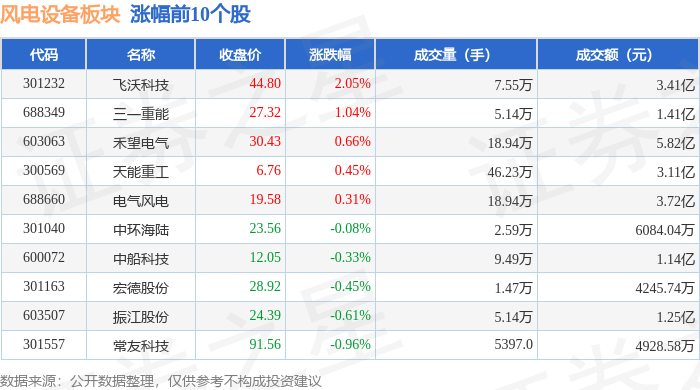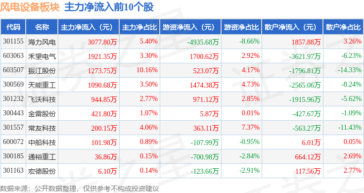 从资金流向上来看,当日风电设备板块主力资金净流出8.75亿元,游资资金净流入1.81亿元,散户资金净流入6.94亿元。风电设备板块个股资金流向见下表: