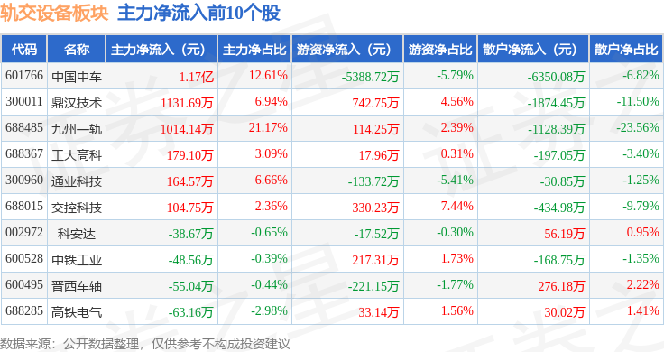 从资金流向上来看,当日轨交设备板块主力资金净流出673.96万元,游资资金净流出600.11万元,散户资金净流入1274.07万元。轨交设备板块个股资金流向见下表: