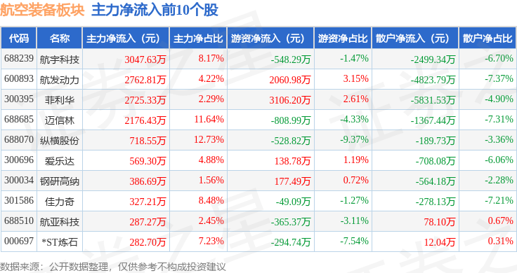从资金流向上来看,当日航空装备板块主力资金净流出5.41亿元,游资资金净流入3.07亿元,散户资金净流入2.34亿元。航空装备板块个股资金流向见下表: