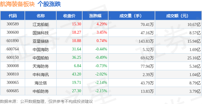 证券之星消息,11月4日航海装备板块较上一交易日下跌0.55%,中船防务领跌。当日上证指数报收于3960.19,下跌0.41%。深证成指报收于13175.22,下跌1.71%。航海装备板块个股涨跌见下表: