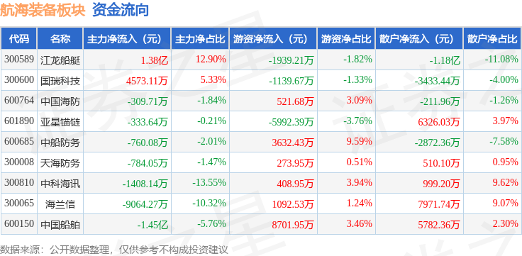从资金流向上来看,当日航海装备板块主力资金净流出8805.81万元,游资资金净流入5560.21万元,散户资金净流入3245.6万元。航海装备板块个股资金流向见下表: