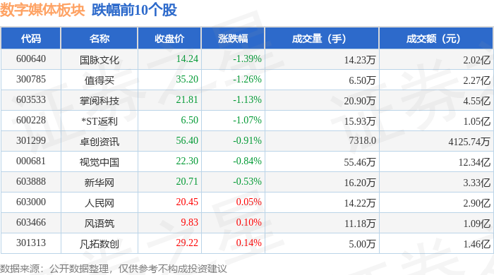 证券之星消息,11月4日数字媒体板块较上一交易日下跌0.16%,国脉文化领跌。当日上证指数报收于3960.19,下跌0.41%。深证成指报收于13175.22,下跌1.71%。数字媒体板块个股涨跌见下表: