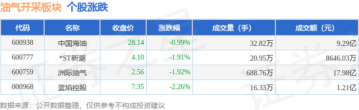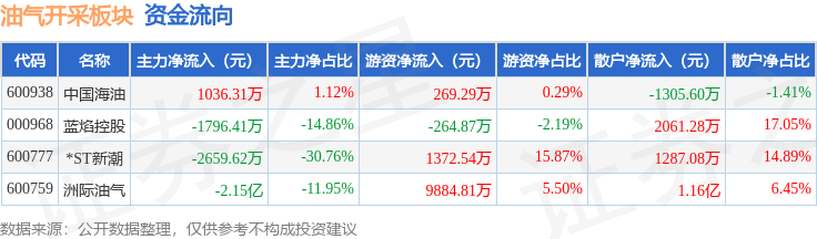 从资金流向上来看,当日油气开采板块主力资金净流出2.49亿元,游资资金净流入1.13亿元,散户资金净流入1.36亿元。油气开采板块个股资金流向见下表: