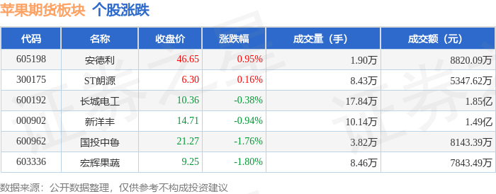 证券之星消息,11月4日苹果期货板块较上一交易日下跌0.53%,宏辉果蔬领跌。当日上证指数报收于3960.19,下跌0.41%。深证成指报收于13175.22,下跌1.71%。苹果期货板块个股涨跌见下表:
