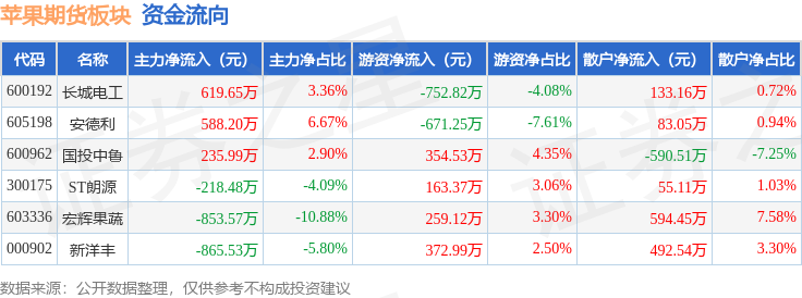 从资金流向上来看,当日苹果期货板块主力资金净流出493.74万元,游资资金净流出274.06万元,散户资金净流入767.8万元。苹果期货板块个股资金流向见下表: