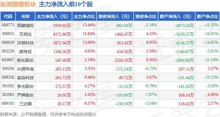 从资金流向上来看,当日盐湖提锂板块主力资金净流出60.34亿元,游资资金净流入8.42亿元,散户资金净流入51.92亿元。盐湖提锂板块个股资金流向见下表: