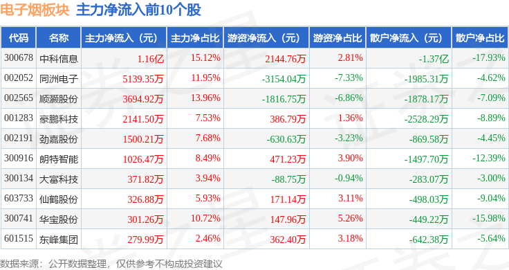 从资金流向上来看,当日电子烟板块主力资金净流出48.31亿元,游资资金净流入9.63亿元,散户资金净流入38.69亿元。电子烟板块个股资金流向见下表: