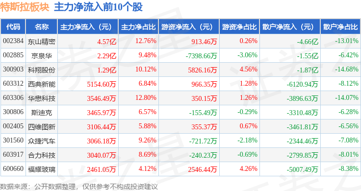 从资金流向上来看,当日特斯拉板块主力资金净流出149.89亿元,游资资金净流入32.88亿元,散户资金净流入117.01亿元。特斯拉板块个股资金流向见下表: