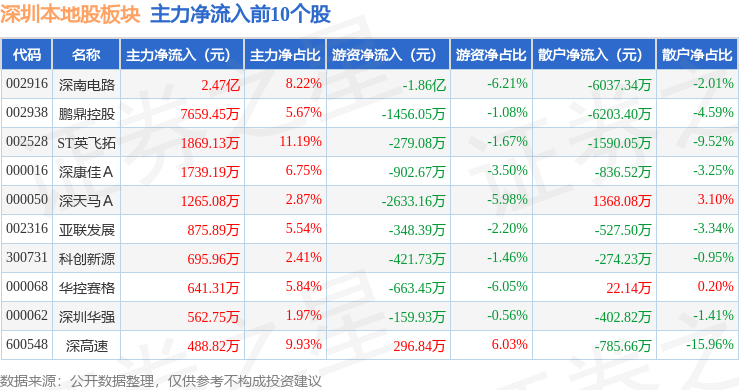 从资金流向上来看,当日深圳本地股板块主力资金净流出24.27亿元,游资资金净流入3.07亿元,散户资金净流入21.2亿元。深圳本地股板块个股资金流向见下表:
