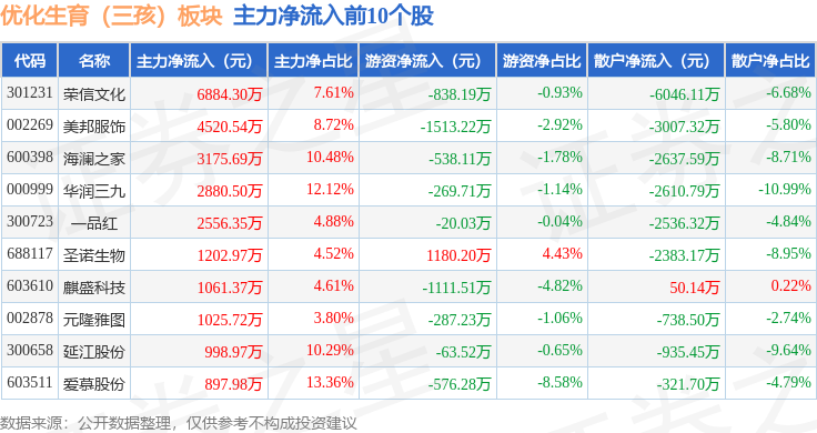 从资金流向上来看,当日优化生育(三孩)板块主力资金净流出15.22亿元,游资资金净流入1.95亿元,散户资金净流入13.27亿元。优化生育(三孩)板块个股资金流向见下表: