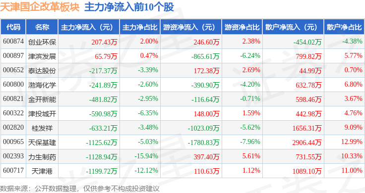 从资金流向上来看,当日天津国企改革板块主力资金净流出1.14亿元,游资资金净流出2381.25万元,散户资金净流入1.38亿元。天津国企改革板块个股资金流向见下表: