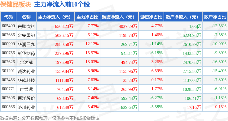 从资金流向上来看,当日保健品板块主力资金净流出17.56亿元,游资资金净流入6.96亿元,散户资金净流入10.6亿元。保健品板块个股资金流向见下表: