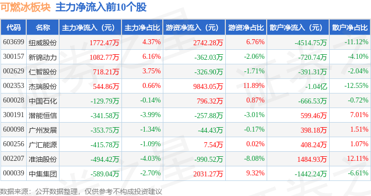 从资金流向上来看,当日可燃冰板块主力资金净流出5.88亿元,游资资金净流入1.84亿元,散户资金净流入4.03亿元。可燃冰板块个股资金流向见下表: