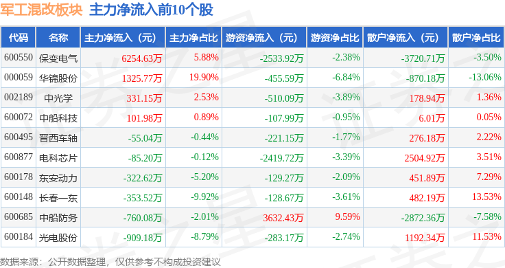 从资金流向上来看,当日军工混改板块主力资金净流出8.38亿元,游资资金净流入2.52亿元,散户资金净流入5.85亿元。军工混改板块个股资金流向见下表: