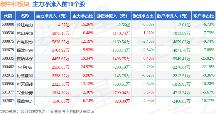 从资金流向上来看,当日碳中和板块主力资金净流出38.76亿元,游资资金净流入12.77亿元,散户资金净流入25.99亿元。碳中和板块个股资金流向见下表:
