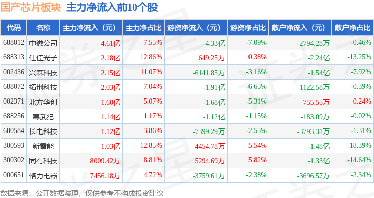 从资金流向上来看,当日国产芯片板块主力资金净流出119.39亿元,游资资金净流入42.9亿元,散户资金净流入76.49亿元。国产芯片板块个股资金流向见下表: