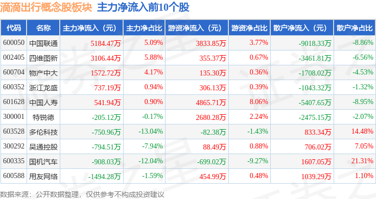 从资金流向上来看,当日滴滴出行概念股板块主力资金净流出3.29亿元,游资资金净流入2.12亿元,散户资金净流入1.17亿元。滴滴出行概念股板块个股资金流向见下表: