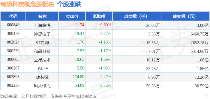 证券之星消息,11月4日商汤科技概念股板块较上一交易日下跌2.05%,科大讯飞领跌。当日上证指数报收于3960.19,下跌0.41%。深证成指报收于13175.22,下跌1.71%。商汤科技概念股板块个股涨跌见下表: