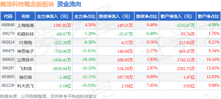 从资金流向上来看,当日商汤科技概念股板块主力资金净流出7.13亿元,游资资金净流入2.27亿元,散户资金净流入4.86亿元。商汤科技概念股板块个股资金流向见下表: