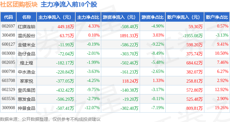 从资金流向上来看,当日社区团购板块主力资金净流出4.2亿元,游资资金净流入3155.61万元,散户资金净流入3.89亿元。社区团购板块个股资金流向见下表: