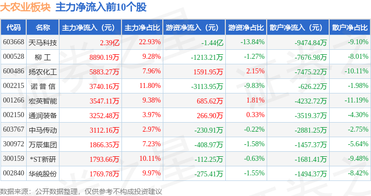 从资金流向上来看,当日大农业板块主力资金净流出22.85亿元,游资资金净流入6.45亿元,散户资金净流入16.4亿元。大农业板块个股资金流向见下表:
