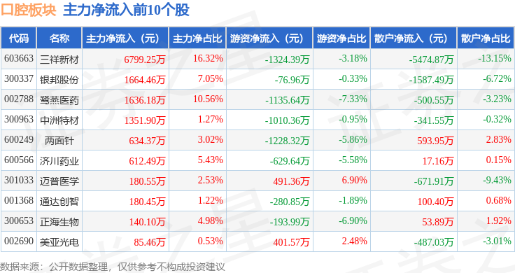 从资金流向上来看,当日口腔板块主力资金净流出8.88亿元,游资资金净流入2.6亿元,散户资金净流入6.28亿元。口腔板块个股资金流向见下表: