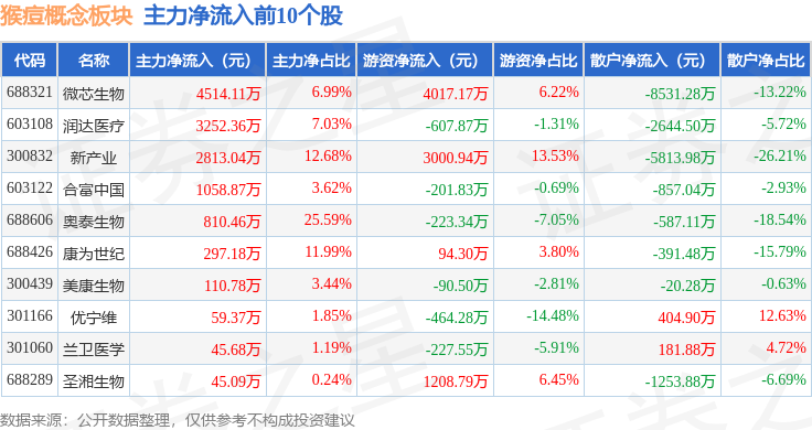 从资金流向上来看,当日猴痘概念板块主力资金净流出2.29亿元,游资资金净流入1.8亿元,散户资金净流入4935.03万元。猴痘概念板块个股资金流向见下表: