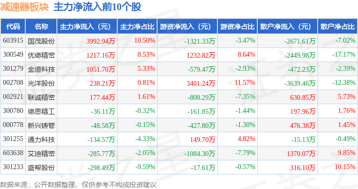 从资金流向上来看,当日减速器板块主力资金净流出22.47亿元,游资资金净流入3.84亿元,散户资金净流入18.63亿元。减速器板块个股资金流向见下表: