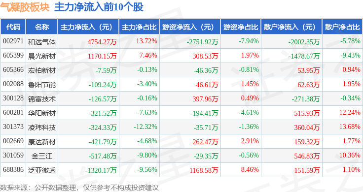 从资金流向上来看,当日气凝胶板块主力资金净流出7.65亿元,游资资金净流入9429.75万元,散户资金净流入6.71亿元。气凝胶板块个股资金流向见下表: