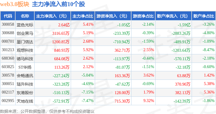 从资金流向上来看,当日web3.0板块主力资金净流出8.84亿元,游资资金净流入1.47亿元,散户资金净流入7.37亿元。web3.0板块个股资金流向见下表: