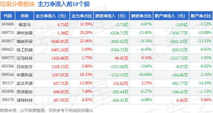 从资金流向上来看,当日垃圾分类板块主力资金净流出1.67亿元,游资资金净流出2.32亿元,散户资金净流入4.0亿元。垃圾分类板块个股资金流向见下表: