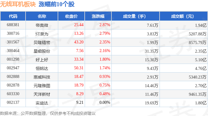 证券之星消息,11月4日无线耳机板块较上一交易日下跌2.81%,汉威科技领跌。当日上证指数报收于3960.19,下跌0.41%。深证成指报收于13175.22,下跌1.71%。无线耳机板块个股涨跌见下表: