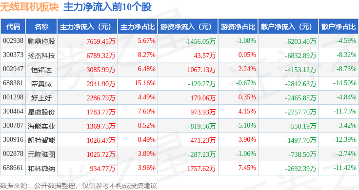 从资金流向上来看,当日无线耳机板块主力资金净流出87.21亿元,游资资金净流入18.03亿元,散户资金净流入69.18亿元。无线耳机板块个股资金流向见下表: