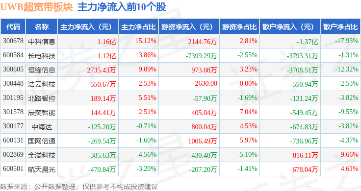 从资金流向上来看,当日UWB超宽带板块主力资金净流出3.51亿元,游资资金净流入1.1亿元,散户资金净流入2.41亿元。UWB超宽带板块个股资金流向见下表: