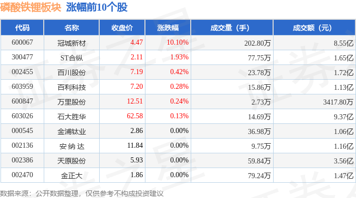 证券之星消息,11月4日磷酸铁锂板块较上一交易日下跌2.45%,万润新能领跌。当日上证指数报收于3960.19,下跌0.41%。深证成指报收于13175.22,下跌1.71%。磷酸铁锂板块个股涨跌见下表: