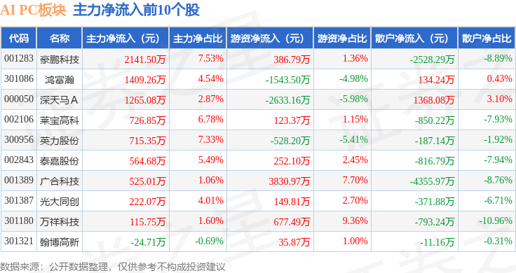 从资金流向上来看,当日AI PC板块主力资金净流出25.33亿元,游资资金净流入6.19亿元,散户资金净流入19.14亿元。AI PC板块个股资金流向见下表: