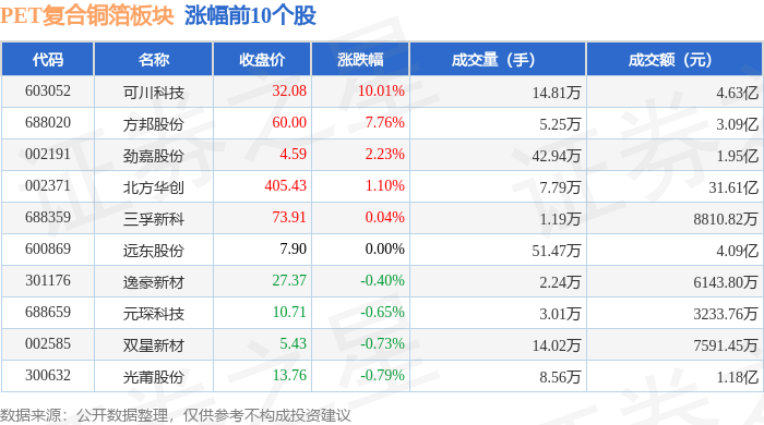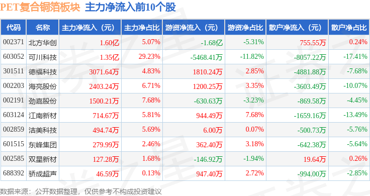 从资金流向上来看,当日PET复合铜箔板块主力资金净流出5.48亿元,游资资金净流入9660.6万元,散户资金净流入4.52亿元。PET复合铜箔板块个股资金流向见下表: